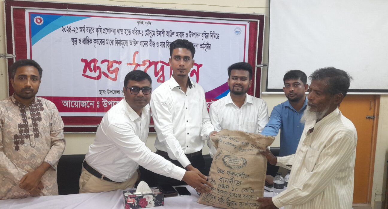 এদিন উপজেলার ৭ ইউনিয়নের ৯ শতাধিক চাষীদের মাঝে প্রতি জনকে ৫ কেজি করে উচ্চ ফলনশীল জাতের আউশ(ব্রিধান-৯৮) ধানের বীজ, ১০কেজি এমওপি ও ১০ কেজি করে টিএসপি সার প্রদান করা হয়।