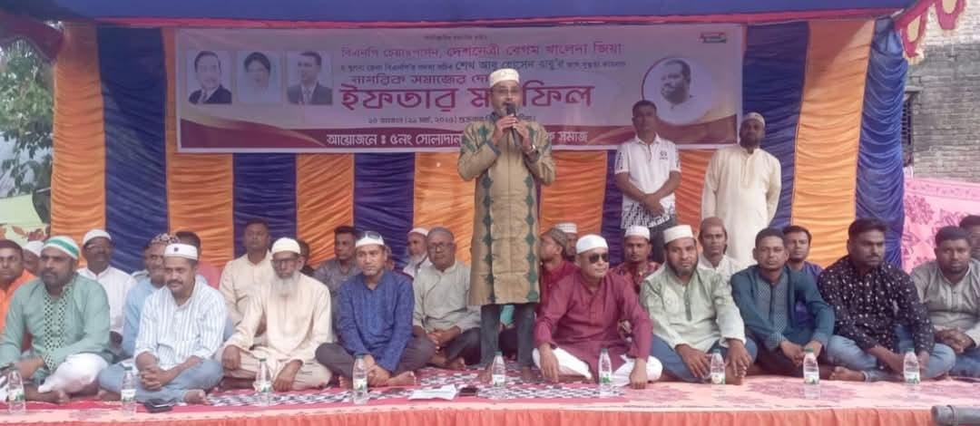 বিএনপি চেয়ারপারসন দেশনেত্রীী বেগম খালেদা জিয়া ও খুলনা জেলা বিএনপির সদস্য সচিব শেখ আবু হোসেন বাবুর সুস্থতা কামনায় নাগরিক সমাজের উদ্যোগে দোয়া ও ইফতার মাহফিল অনুষ্ঠিত হয়েছে। শুক্রবার বিকেলে উপজেলার সোলাদানা ইউনিয়নের ভেকটমারী সরকারী প্রাথমিক বিদ্যালয় মাঠে এ দোয়া ও ইফতার মাহফিল এর আয়োজন করা হয়। নাগরিক সমাজের আফসার আলী সানার সভাপতিত্বে ইফতার পূর্ব আলোচনা সভায় প্রধান অতিথি ছিলেন,উপজেলা বিএনপির সাবেক সাধারণ সম্পাদক ও সোলাদানা ইউনিয়নের সাবেক চেয়ারম্যান এস এম এনামুল হক। প্রধান বক্তা ছিলেন উপজেলা বিএনপির সম্মেলন প্রস্তুতি কমিটির সদস্য সচিব সাবেক প্যানেল মেয়র এস এম ইমদাদুল হক। উপস্থিত ছিলেন, বিএনপি নেতা শেখ ইমাদুল ইসলাম, সাবেক কাউন্সিলর কামাল আহম্মেদ সেলিম নেওয়াজ, শেখ সাদেকুজ্জুামান, কাজী সাজ্জাদ আহম্মেদ মানিক, শেখ বেনজির আহম্মেদ লাল, সরদার ফারুক আহম্মেদ, এ্যাড, একরামুল হক বিশ্বাস , সুজিত কুমার মন্ডল, আমিনুর সরদার, আব্দুস সাত্তার মোড়ল, আব্দুল হাকিম সানা, সন্তোষ কুমার গাইন, আনারুল কাদির, আব্দুল গফুর মেম্বর, ইব্রাহীম গাজী, বাবু সামাদ, আবুল বাশার বাচ্চু, হাবিবুর রহমান, লিপটন সরদার, কাজী সিরাজ, ইসরাফিল মোড়ল, হযরত গাজী, রুস্তুম গাজী, ইমরান সরদার, যজ্ঞেশ্বর কার্তিক, মশিয়ার রহমান মিলন, আব্দুল্লাহ আল গালিব,আনারুল ইসলাম, সাদ্দাম হোসেন, সোহেল গাজী, ইউনুস মোল্লা ও ফয়সাল রাশেদ সনি।