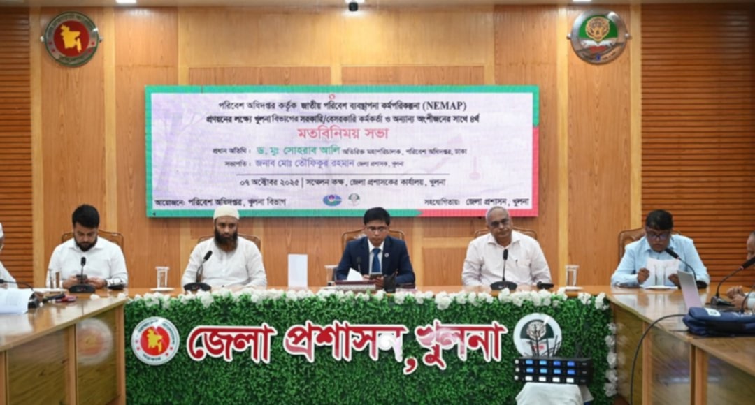 জাতীয় পরিবেশ ব্যবস্থাপনা কর্মপরিকল্পনা (NEMAP) প্রণয়নের লক্ষ্যে খুলনা বিভাগীয় পর্যায়ে পরিবেশ অধিদপ্তরের উদ্যোগে ৪র্থ মতবিনিময় সভা অনুষ্ঠিত হয়েছে। মঙ্গলবার (০৭ অক্টোবর) জেলা প্রশাসকের সম্মেলন কক্ষে এ সভার আয়োজন করা হয়।