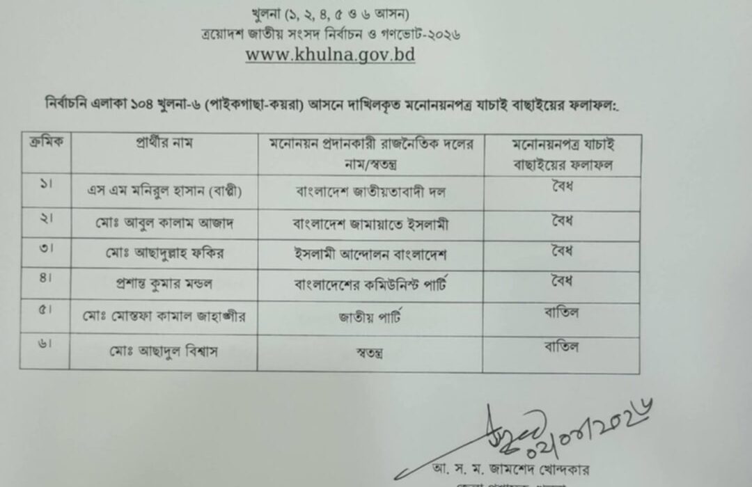 খুলনা-৬ আসনে দুই প্রার্থীর মনোনয়ন বাতিল, চারজনের বৈধতা ঘোষণা