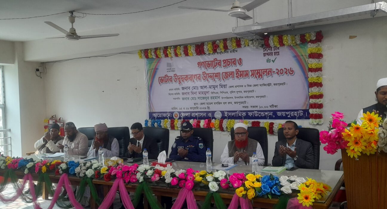 “দেশের চাবি আপনার হাতে”—এই প্রতিপাদ্যকে সামনে রেখে ভোটার উদ্বুদ্ধকরণ ও গণভোটের প্রচার জোরদার করতে জয়পুরহাটে অনুষ্ঠিত হয়েছে জেলা ইমাম সম্মেলন-২০২৬। জেলা প্রশাসন ও ইসলামিক ফাউন্ডেশনের যৌথ আয়োজনে ২৫ ও ২৬ জানুয়ারি দুই দিনব্যাপী এ সম্মেলন অনুষ্ঠিত হয়।