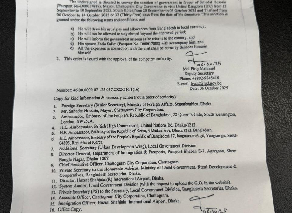 এর আগে গত শুক্রবার রাত আটটায় হযরত শাহজালাল আন্তর্জাতিক বিমানবন্দর হয়ে যুক্তরাজ্যের উদ্দেশ্যে দেশ ছাড়েন চট্টগ্রাম সিটি কর্পোরেশনের মেয়র ডা. শাহাদাত হোসেন। আগামী ২১ নভেম্বর ঢাকায় ফেরার কথা রয়েছে চসিক মেয়রের।
