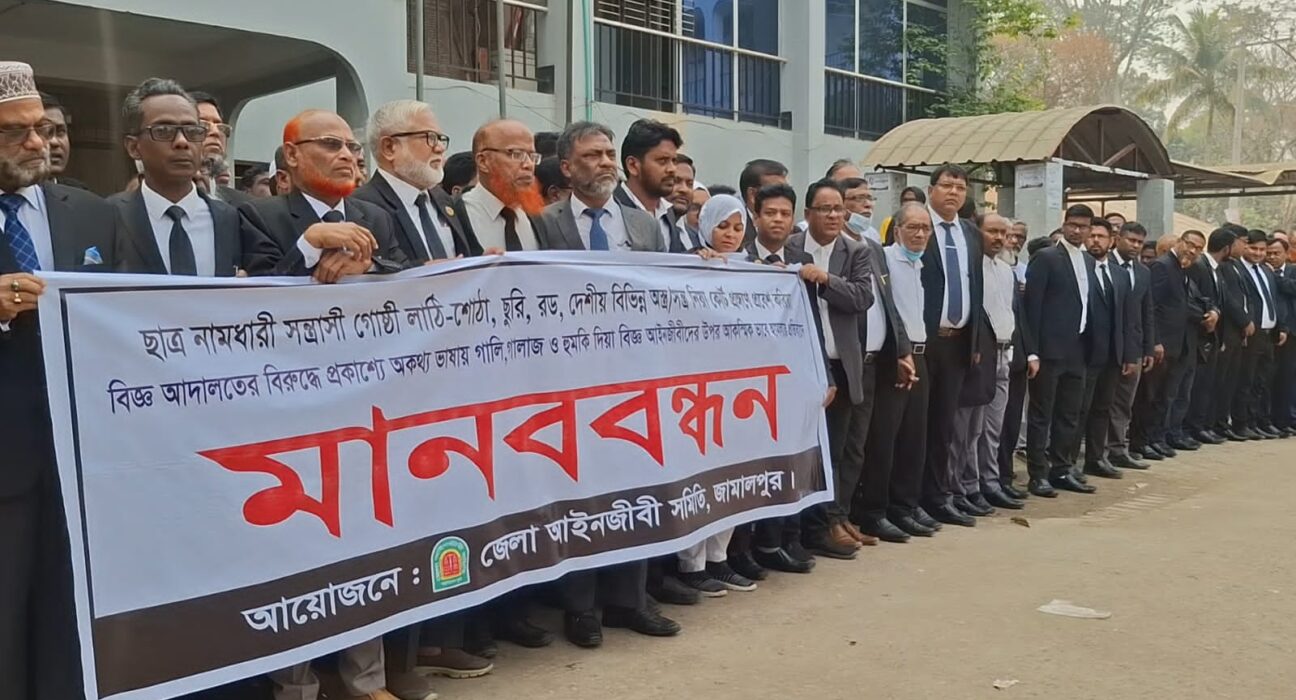 জামালপুরে আইনজীবীদের ওপর হামলার প্রতিবাদে মানববন্ধন অনুষ্ঠিত হয়েছে।