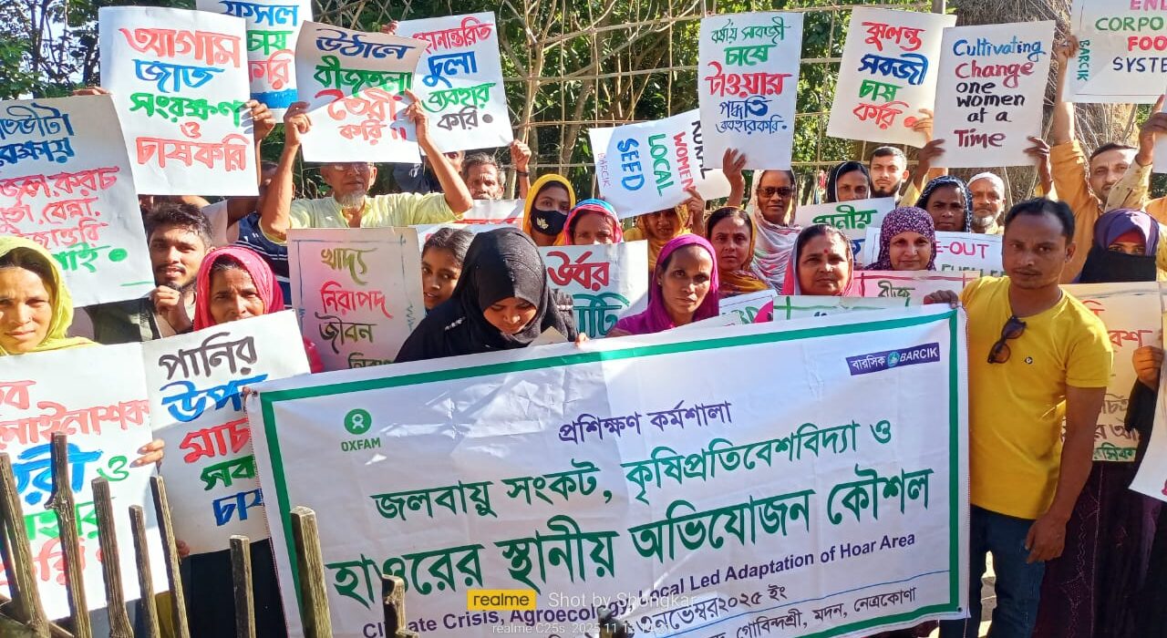 ডেস্ক রিপোর্ট :জলবায়ু সংকট মোকাবেলা করে হাওরে টিকে আছে কৃষকেরা।বেসরকারী গবেষণা প্রতিষ্ঠান বাংলাদেশ রিসোর্স সেন্টার ফর ইনডিজেনাস নলেজ (বারসিক) এর আয়োজনে ও দাতা সংস্থা অক্সফামের সহযোগিতায় গোবিন্দশ্রী উচাঁহাটিতে সালমা বেগমের “কৃষিপ্রতিবেশবিদ্যা শিখন কেন্দে” জলবায়ু পরিবর্তন, কৃষিপ্রতিবেশবিদ্যা ও হাওর অভিযোজন কৌশল বিষয়ক” দু‘দিনব্যাপী এক কর্মশালার আয়োজন করা হয়। সভাপতি ছিলেন উচাহাটি কৃষিপ্রতিবেশবিদ্যা শিখন কেন্দ্রের তত্ত্বাবধায়ক কৃষানি সালমা আকতার, প্রশিক্ষক হিসেবে উপস্থিত ছিলেন বারসিকের নেত্রকোনা অঞ্চলের সহযোগি সমন্বয়কারী শংকর ম্রং। আরো উপস্থিত ছিলেন গোবিন্দশ্রী ইউনিয়নের বারঘরিয়া, উচাহাটি, মাঝিপাড়া, পশ্চিমপাড়া, শান্তিপাড়া, বারঘরিয়া, মদন ইউনিয়নের উচিতপুর, আরগিলা, দক্ষিণমদন ও কুলিয়াটি গ্রামের ২৬ জন কৃষক-কৃষানি-যুবক-কিশোরী। কর্মশালায় কৃষিপ্রতিবেশবিদ্যা, আবহাওয়া, জলবায়ু,দুর্যোগ,জলবায়ু ন্যায্যতা,হাওরের কৃষিক্ষেত্রে দুর্যোগ মোকাবেলায়অভিযোজনকৌশল, খাদ্যসার্বভৌমত্ব,দুর্যোগ মোকাবেলায় হাওরের নারীর অভিযোজন কৌশল নিয়ে বিস্তারিত আলোচনা করা হয়।
