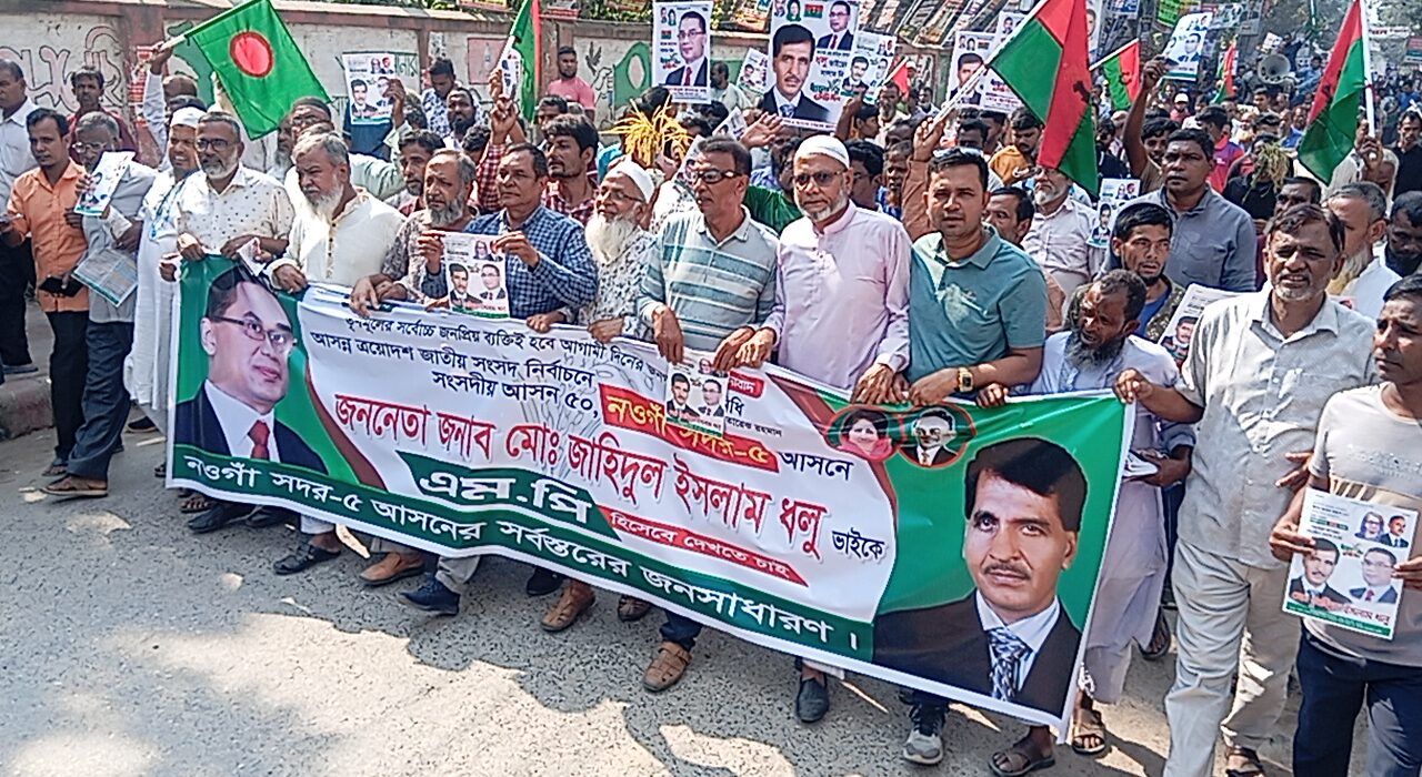 ধানের শীষের পক্ষে জনমত গঠনে নওগাঁয় ধলুর লিফলেট বিতরণ কর্মসূচি
