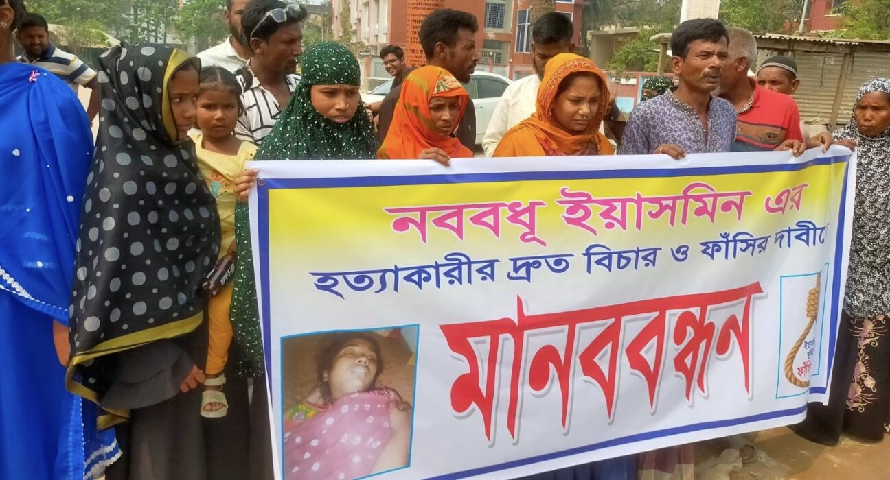 মানববন্ধনে ইয়াসমিনের বাবা রিয়াজ উদ্দিন বলেন, আমি গরীব মানুষ। মানুষের কাছে হাত পেতে বিয়েতে মেয়েকে স্বর্ণালংকার বাবদ প্রায় ৫০ হাজার টাকা দিয়েছি। আমার মেয়ে জামাই পরকীয়ায় জড়িয়ে পড়লে এর প্রতিবাদ করায় আমার মেয়েকে শারীরিক নির্যাতন করে জামাই আকাশ সহ তার পরিবারের লোকজন। এক পর্যায়ে সে ও তার পরিবারের সদস্যরা আমার মেয়েকে নির্যাতন ও মারপিট করে হত্যা করা হয় জানিয়ে তিনি মেয়ে হত্যার বিচার বিচার দাবি করেন। নিহতের বোন রেশমা খাতুন বলেন, আমার বোনকে মারপিট করে হত্যা করা হয়েছে। মারা যাওয়ার পর তার সারা শরীরে আঘাতের চিহ্ন, চোয়াল ফুলা-কালসিরা জখম এবং নাকে রক্তের দাগ ছিল। পরে সত্য ঘটনাকে গোপন করার জন্য পুলিশকে প্রভাবিত করে কৌশলে সাদা কাগজে সই নিয়ে থানায় একটি অপমৃত্যু মামলা রেকর্ড করে আর আমাদেরকে বলেন হত্যা মামলা রেকর্ড হয়েছে তদন্ত করে ব্যবস্থা নেওয়া হবে।