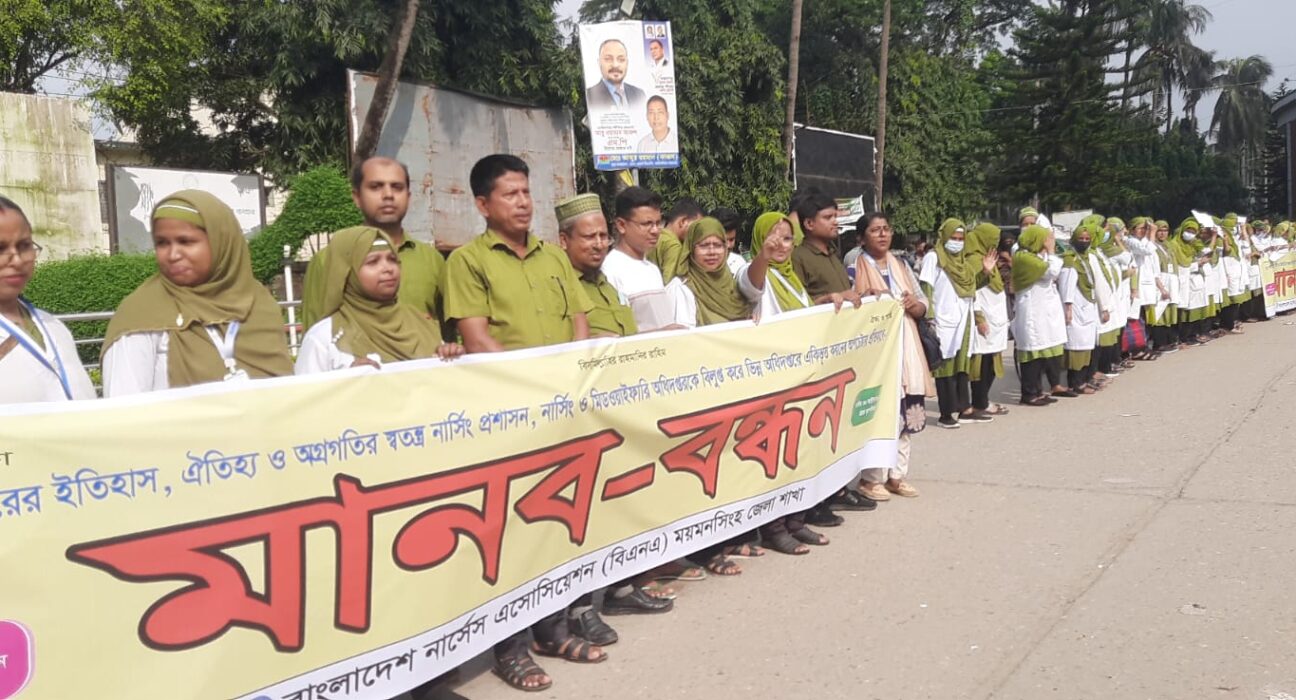 নার্সিং অধিদপ্তর বিলুপ্তের ষড়যন্ত্রের প্রতিবাদে ময়মনসিংহে নার্সদের মানববন্ধন
