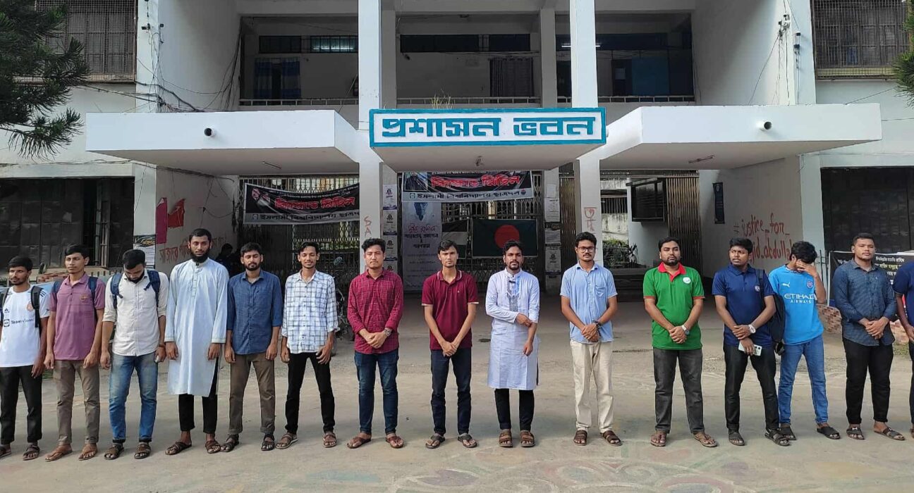 বুধবার (২৪ সেপ্টেম্বর) দুপুর আড়াই টার দিকে বিশ্ববিদ্যালয়ের প্রশাসন ভবনের সামনে এ মানববন্ধন কর্মসূচি পালন করে তারা।