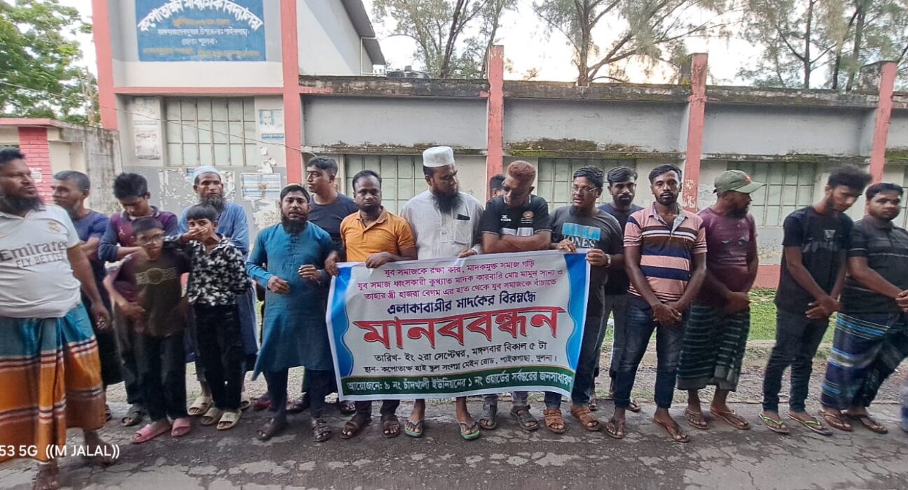 পাইকগাছায় কুখ্যাত মাদক কারবারি মোঃ মামুন সানা ও তার স্ত্রী হাজরা বেগমের হাত থেকে যুব সমাজকে রক্ষা ও শাস্তির দাবিতে এলাকাবাসীর উদ্যোগে এক মানববন্ধন অনুষ্ঠিত হয়েছে।