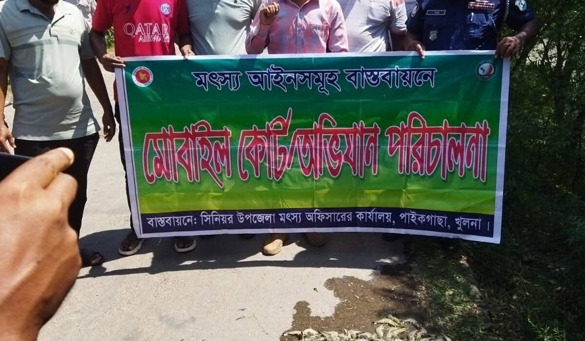 অভিযানে মেরিন ফিশারিজ কর্মকর্তা তরিকুল ইসলাম, নৌ-পুলিশের উপ-পরিদর্শক আব্দুস সবুর, পাইকগাছা মৎস্য আড়ৎদারি সমিতির সাধারণ সম্পাদক বেল্লাল মোড়ল, নির্বাহী সদস্য ফুলমিয়া সরদার, মোঃ হাফিজুর রহমান সহ সঙ্গীয় ফোর্স অংশগ্রহণ করেন।