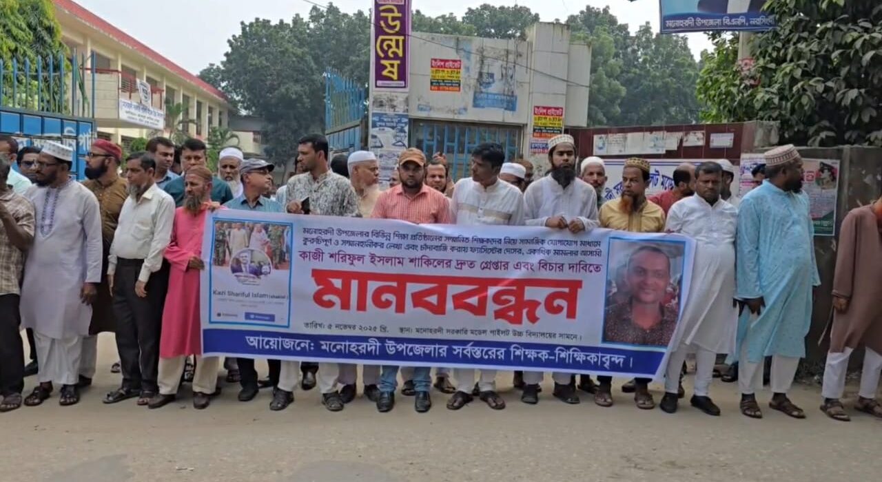 নিজস্ব প্রতিবেদক : নরসিংদীর মনোহরদীতে বিভিন্ন শিক্ষাপ্রতিষ্ঠানের শিক্ষকদের নিয়ে সামাজিক যোগাযোগ মাধ্যমে অপপ্রচার ও কুরুচিপূর্ণ মন্তব্যকারী শরীফুল ইসলাম শাকিলকে দ্রুত গ্রেফতার ও বিচারের দাবিতে মানববন্ধন করেছে শিক্ষক শিক্ষিকারা।