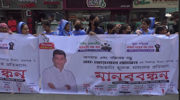 ঢাকার দক্ষিণ কেরানীগঞ্জে ‘মানবতার ফেরিওয়ালা’ হিসেবে পরিচিত ব্যবসায়ী আয়নাল হোসেনের বিরুদ্ধে আওয়ামী লীগের ভুয়া পদবী ব্যবহার করে দায়ের করা কথিত মিথ্যা মামলার প্রতিবাদে মানববন্ধন কর্মসূচি পালন করেছেন এলাকাবাসী।