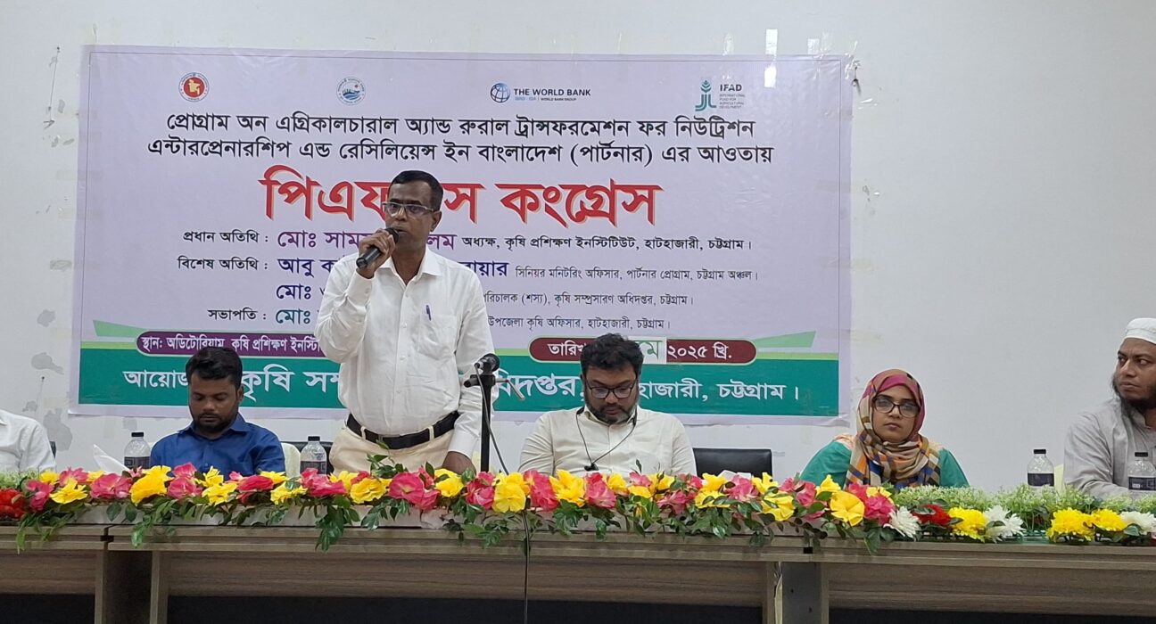 হাটহাজারীতে প্রোগ্রাম অন এগ্রিকালচারাল অ্যান্ড রুরাল ট্রান্সফরমেশন ফর নিউট্রিশন এন্টারপ্রেনারশিপ এন্ড রেজিলিয়েন্স ইন বাংলাদেশ (পার্টনার) এর আওতায় কৃষকদের নিয়ে পিএফএস কংগ্রেস উপজেলা কৃষি অফিসার আল মামুন শিকদারের সভাপতিত্বে কৃষি প্রশিক্ষণ ইন্সটিটিউট এর অডিটোরিয়ামে অনুষ্ঠিত হয়েছে। বৃহস্পতিবার (২২মে) বিকেলে কৃষি সম্প্রসারণ অধিদপ্তর হাটহাজারীর আয়োজনে এতে প্রধান অতিথি ছিলেন, কৃষ ইন্সটিটিউট এর অধ্যক্ষ মো. সামশুল আলম। বিশেষ অতিথি ছিলেন, চট্টগ্রাম অঞ্চলের পার্টনার প্রোগ্রামের সিনিয়র মনিটরিং অফিসার আবু কাউছার মো. সরোয়ার। উপ সহকারী কৃষি কর্মকর্তা নুরুল আবছারের উপস্থাপনায় অন্যান্যদের মধ্যে বক্তব্যে রাখেন, কৃষি সম্প্রসারণ অধিদপ্তর চট্টগ্রামের অতিরিক্ত উপপরিচালক (শষ্য) মো. ওমর ফারুক, অতিরিক্ত উপপরিচালক (উদ্যান) রোকনাথ নাহা, অতিরিক্ত পরিচালক (উদ্ভিদ সংরক্ষণ) হাবিবুন নেছা। এতে উপজেলার পৌরসভা ও ১৪ টি ইউনিয়নের উদ্যোক্তা ও প্রান্তিক কৃষক উপস্থিত ছিলেন।