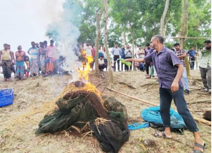 নওগাঁয় মৎস অধিদপ্তরের অবৈধ সুতিজাল উচ্ছেদ অভিযান।