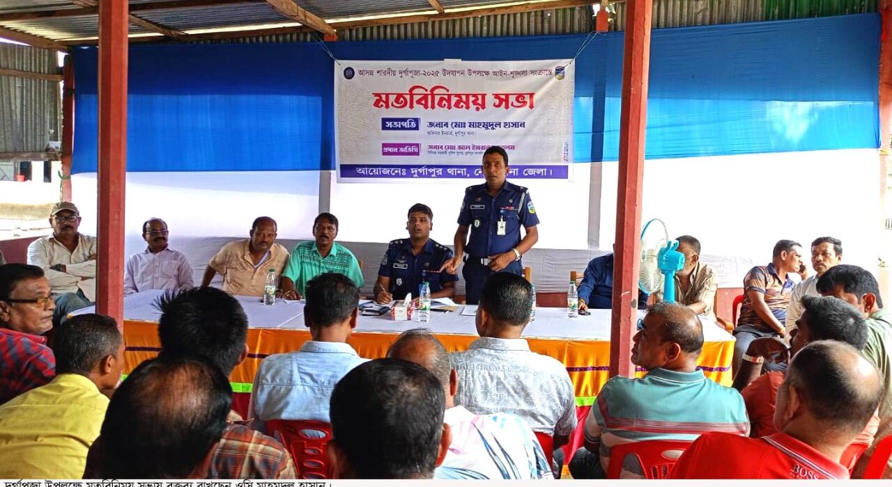 মতবিনিময় সভায় দুর্গাপুর থানার অফিসার ইনচার্জ মো. মাহমুদুল হাসানের সভাপতিত্বে এতে প্রধান অতিথি হিসেবে বক্তব্য রাখেন, সিনিয়র সহকারী পুলিশ সুপার (দুর্গাপুর সার্কেল) মো. আল ইমরানুল আলম। অন্যদের মাঝে বক্তব্য রাখেন, বাংলাদেশ হিন্দু বৌদ্ধ খৃষ্টান কল্যাণ ফ্রন্টের দুর্গাপুর উপজেলা শাখার আহবায়ক ও সাবেক মেয়র শুভেন্দু সরকার পিন্টু, সদস্য সচিব কবি বিদ্যুৎ সরকার, বাংলাদেশ পূজা উদযাপন পরিষদের দুর্গাপুর উপজেলা শাখার সভাপতি এডভোকেট মানেশ চন্দ্র সাহা, সাধারণ সম্পাদক নির্মলেন্দু সরকার বাবুল, প্রেসক্লাব সভাপতি তোবারক হোসেন খোকন, সাধারণ সম্পাদক মাসুম বিল্লাহ, সাবেক প্রধান শিক্ষক স্বপন সান্যাল সহ উপজেলার বিভিন্ন পুজা মন্ডপ কমিটির নেতৃবৃন্দ।