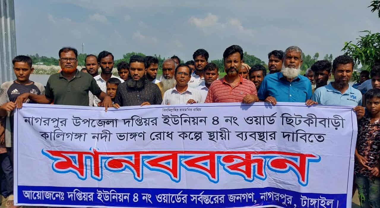 টাঙ্গাইলের নাগরপুর উপজেলার দপ্তিয়র ইউনিয়নের ৪ নম্বর ওয়ার্ডের ছিটকীবাড়ী, মাইঝাইল ও কামুটিয়া গ্রামবাসীর উদ্যোগে যমুনার শাখা নদী কালিগঙ্গার ভয়াবহ ভাঙন রোধে মানববন্ধন অনুষ্ঠিত হয়েছে। সোমবার সকালে শতাধিক মানুষ এ কর্মসূচিতে অংশ নেন।