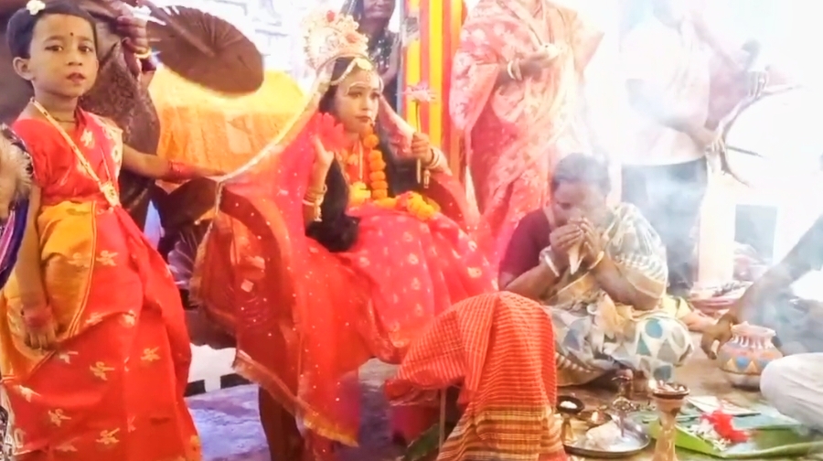 এবার দেবী রুপে পুজিত হয়েছেন শহরের মাদারগঞ্জ এলাকার তপু পালের মেয়ে মডেল সরকারি প্রাথমিক বিদ্যালয়ের চতুর্থ শ্রেণির ছাত্রী আরাধ্যা পাল। পূজায় মন্ত্র পাঠ করেন পুরোহিত চয়ন কুমার অধিকারী।