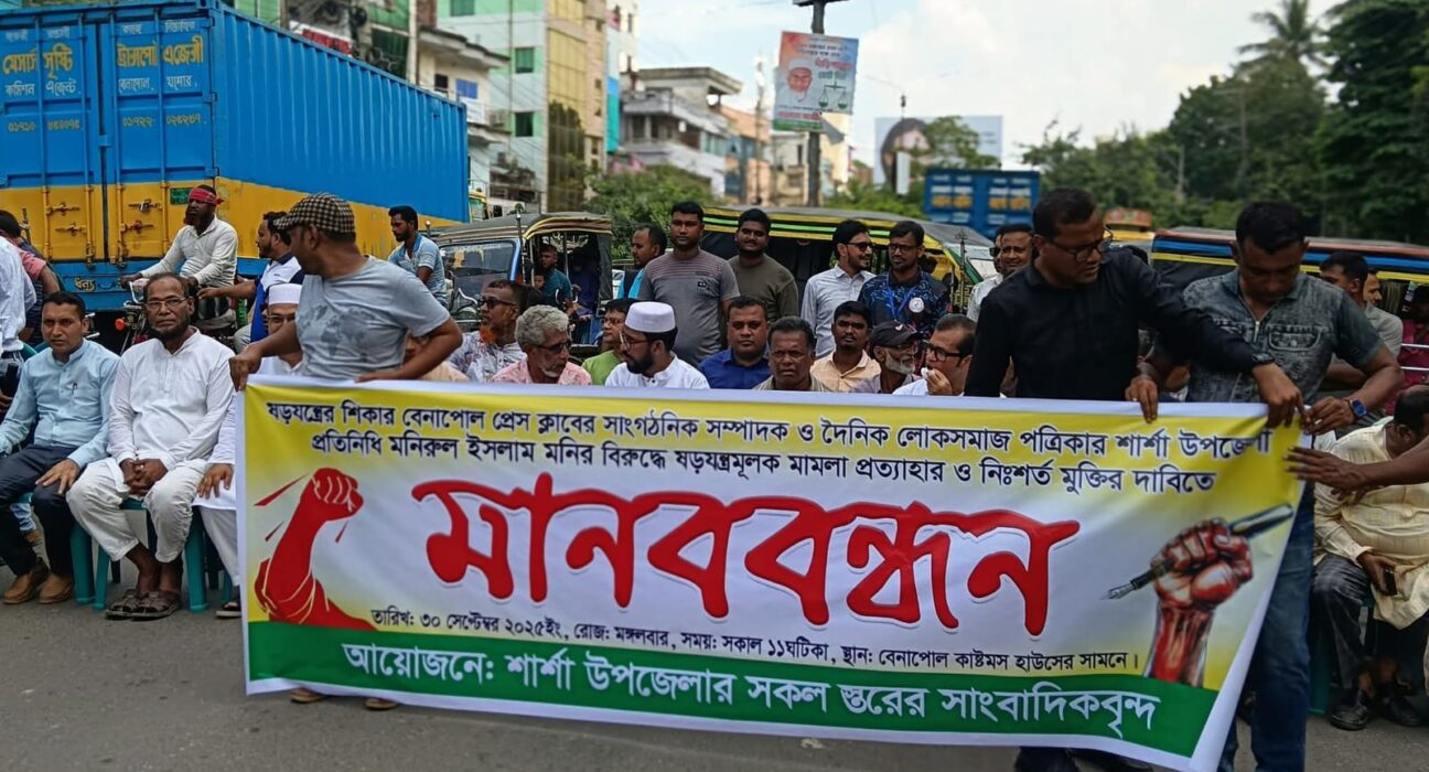 শার্শায় সাংবাদিক মনি’র নিঃশর্তে মুক্তির দাবিতে বেনাপোলে মানববন্ধন ও অবস্থান কর্মসূচি পালন করেন-সাংবাদিক সমাজ