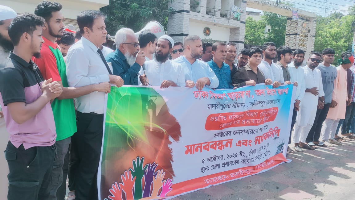 ঢাকা বিভাগ না ছাড়ার দাবীতে মাদারীপুরে মানববন্ধন- স্মারকলিপি প্রদাণ