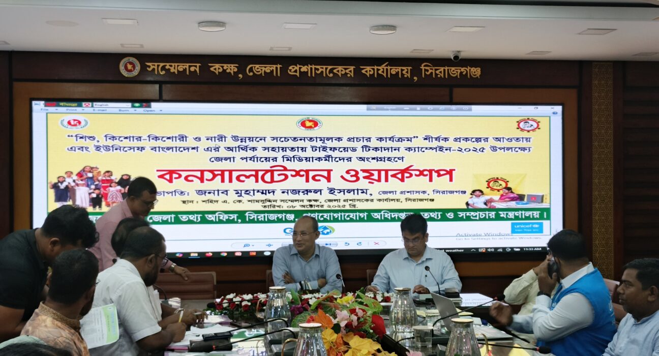 আজ (০৮ অক্টোবর ২০২৫) সিরাজগঞ্জ জেলা প্রশাসকের কার্যালয়ের শহিদ এ. কে. শামসুদ্দিন সম্মেলন কক্ষে আসন্ন টাইফয়েড টিকাদান ক্যাম্পেইন-২০২৫ উপলক্ষে আয়োজিত এক কনসালটেশন ওয়ার্কশপে তিনি এসব কথা বলেন।