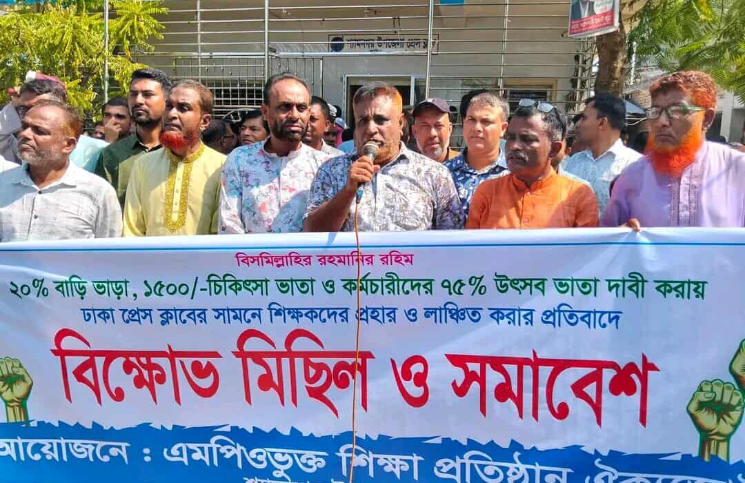বক্তারা বক্তব্যে ২০% বাড়ী ভাড়া, ১৫০০ টাকা চিকিৎসাভাতা ও কর্মচারীদের ৭৫% উৎসবভাতা দাবী করায় ঢাকা প্রেসক্লাবের সামনে শিক্ষকদের লাঞ্চিত করার প্রতিবাদ জানান একই সাথে সরকারের দৃষ্টি কামনা করে শিক্ষকদের দাবী মেনে নেওয়ার আহব্বান জানান।