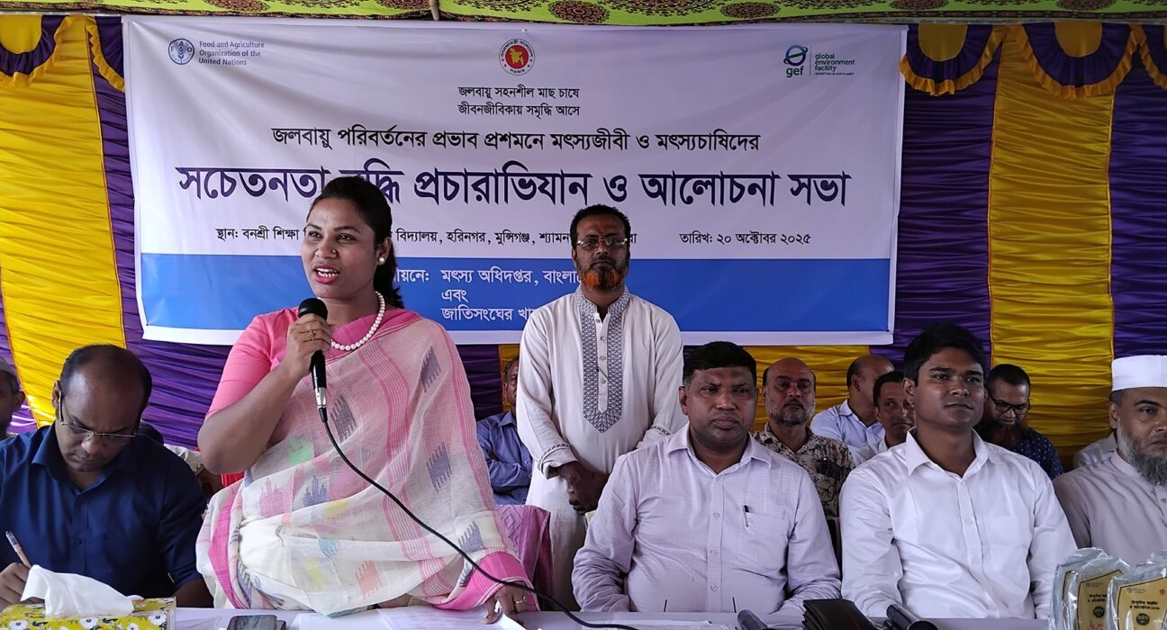 রনজিৎ বর্মন শ্যামনগর (সাতক্ষীরা) প্রতিনিধি ঃ “জলবায়ু সহনশীল মাছ চাষে, জীবনজীবিকায় সমৃদ্ধি আসে” এ স্লোগানকে সামনে নিয়ে সাতক্ষীরার শ্যামনগর উপজেলায় সোমবার(২০ অক্টোবর) মৎস্য অধিদপ্তর বাংলাদেশ ও জাতিসংঘের খাদ্য ও কৃষি সংস্থার বাস্তবায়নে জলবায়ু পরিবর্তনের প্রভাব প্রশমনে মৎস্যজীবি ও মৎস্যচাষিদের সচেতনতাবৃদ্ধি প্রচারাভিযান ও আলোচনাসভা অনুষ্ঠিত হয়।
