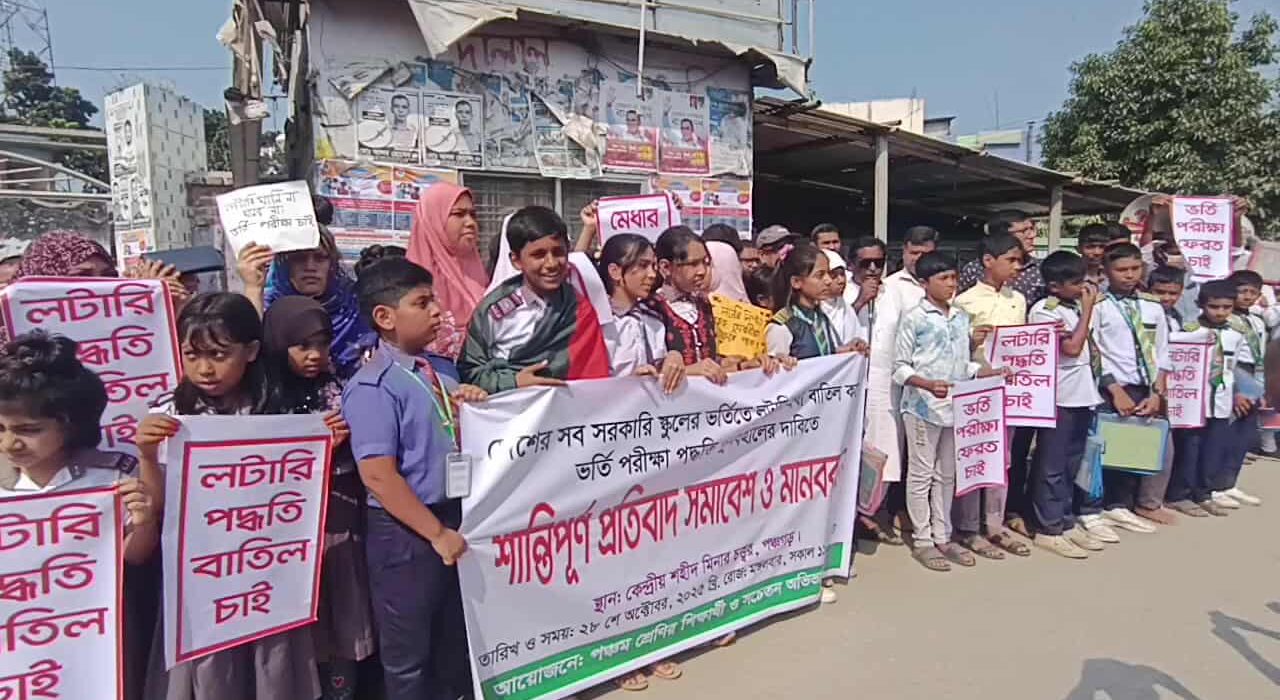 সরকারি স্কুলে ভর্তি প্রক্রিয়ায় লটারী প্রথা বাতিল করে পরীক্ষার মাধ্যমে মেধা যাচাই করে ভর্তির দাবিতে পঞ্চগড়ে মানববন্ধন অনুষ্ঠিত হয়েছে।