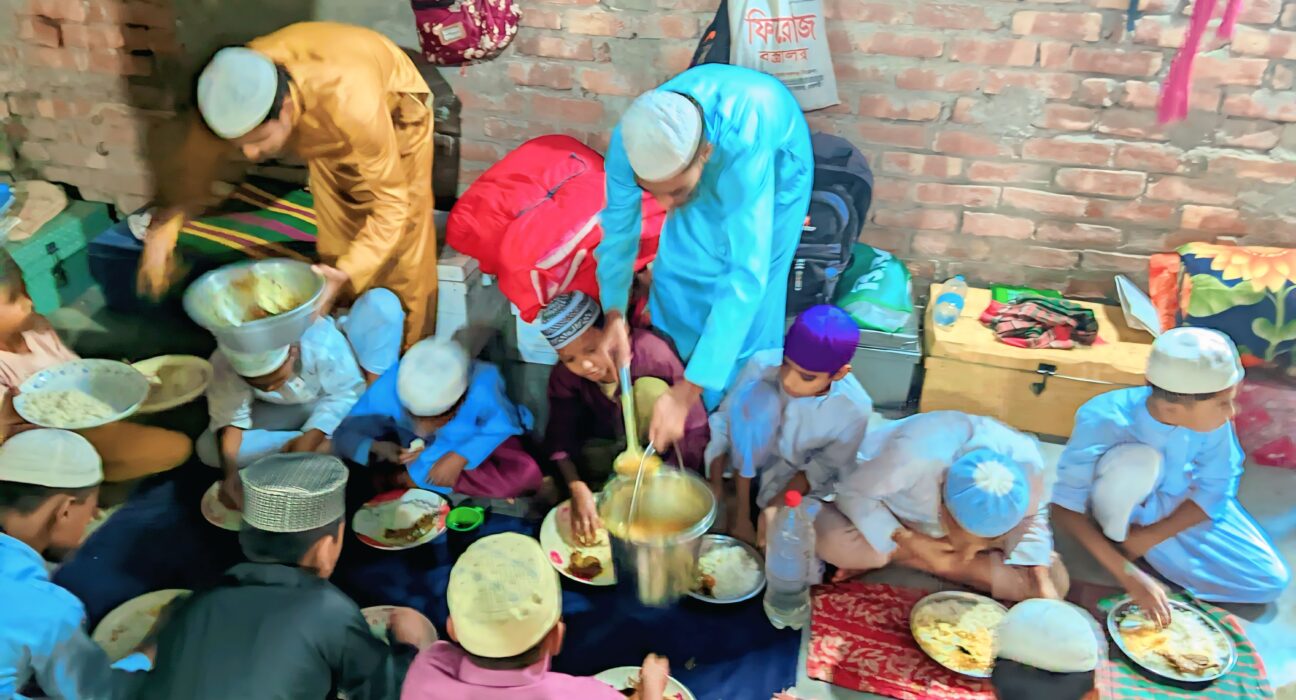 শিক্ষার্থীরা আনন্দের সঙ্গে খাবার গ্রহণ করে এবং সংগঠনের সদস্যদের জন্য দোয়া করে।