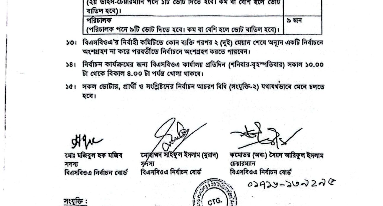 বাংলাদেশ শিল্প হ্যান্ডলিং অ্যান্ড বার্থ অপারেটরস অ্যাসোসিয়েশন (বিএসবিওএ)-এর নির্বাহী কমিটির (২০২৫–২০২৬ ও ২০২৬–২০২৭) নির্বাচনে মনোনয়নপত্র জমা দিতে গিয়ে ঘটেছে এক তুগলকি কান্ড। ঘোষিত তফসিল অনুযায়ী বুধবার (১২ নভেম্বর ২০২৫) ছিল মনোনয়নপত্র জমা দেওয়ার শেষ দিন। কিন্তু নির্ধারিত সময়ের শেষ পর্যন্ত ১২টি পদের বিপরীতে মাত্র সাতজন প্রার্থী মনোনয়নপত্র জমা দিয়েছেন।