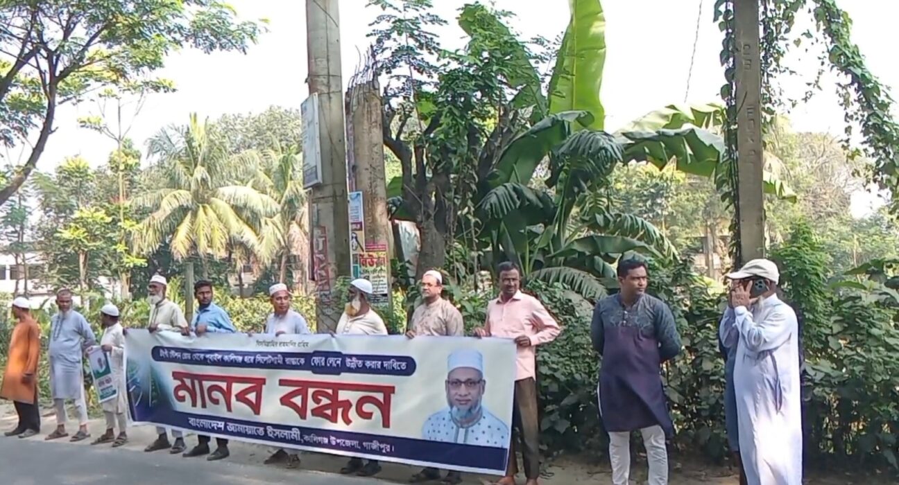 বৃহষ্পতিবার সকাল ১০ টায় কালীগঞ্জ বাইপাস মোড়ে (সরকারি কালিগঞ্জ শ্রমিক কলেজ সংলগ্ন) বাংলাদেশ জামায়াতে ইসলামী, কালীগঞ্জ উপজেলার উদ্যোগে আয়োজিত মানববন্ধনে প্রধান অতিথি তার বক্তব্যে এসব কথা বলেন ।