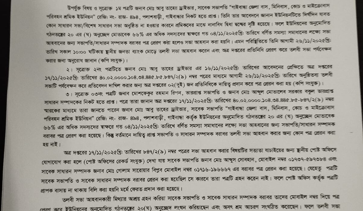 এ পত্রে আরো জানা যায়, গাইবান্ধা জেলা বাস মিনিবাস কোচ ও মাইক্রোবাস শ্রমিক ইউনিয়নের বর্তমান দায়িত্ব প্রাপ্ত ভারপ্রাপ্ত সভাপতি মুশফিকুর রহমান রিপন মোবাইল নং- ০১৭১২৯৩৩৬৪২ এবং ভারপ্রাপ্ত সাধারন সম্পাদক আব্দুল মোত্তালিব সরকার বকুল মোবাইল নং-০১৭১৭২৬৭৫৫৬। সাবেক সভাপতি মোঃ আবু তাহের ড্রাইভার সংগঠনের অনুমোদিত গঠনতন্ত্রের ২০ (ঘ) অনুচ্ছেদ পরিপন্থিভাবে বর্তমান কার্যনির্বাহী কমিটির সভাপতি ও সাধারন সম্পাদক বরাবর সভা আহবান করার জন্য পত্র প্রেরন না করে সাবেক সভাপতি ও সাবেক সাধারন সম্পাদক বরাবর পত্র প্রেরন করেছেন যা সংগঠনের অনুমোদিত গঠনতন্ত্রের ২০ (ঘ) অনুচ্ছেদের সুস্পষ্ট লংঘন। এমতাবস্থায়, সংগঠনের অনুমোদিত গঠনতন্ত্রের ২০ (ঘ) অনুচ্ছেদ লংঘন করে আগামী ২৬/১১/২০২৫খ্রিঃ তারিখে তলবী সভা আহবান করায় উক্ত তলবী সভায় অত্র দপ্তরের প্রতিনিধি প্রেরন করা সম্ভব হলো না। একই সাথে অত্র দপ্তরের আবু তাহের ড্রাইভারের স্বাক্ষরিত ১৬/১১/২০২৫খ্রিঃ তারিখের ৪০.০২.০০০০.১০৪.৩৪.৪৪৫. ৮৫.৮৪৭/২ (৯) নম্বর স্মারকের মাধ্যমে প্রেরীত পত্রটি এতদ্বারা বাতিল করা হয়।