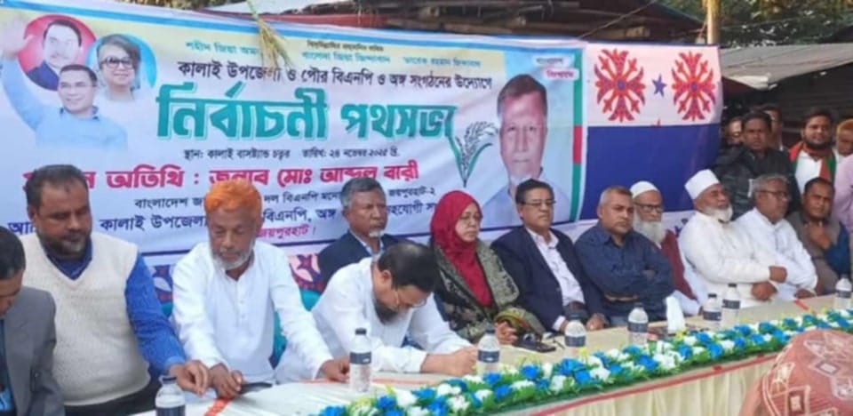 জয়পুরহাটের কালাইয়ে বিএনপি মনোনীত প্রার্থী গণপ্রজাতন্ত্রী বাংলাদেশ সরকারের সাবেক সচিব আব্দুল বারীর নির্বাচনী পথসভা অনুষ্ঠিত।