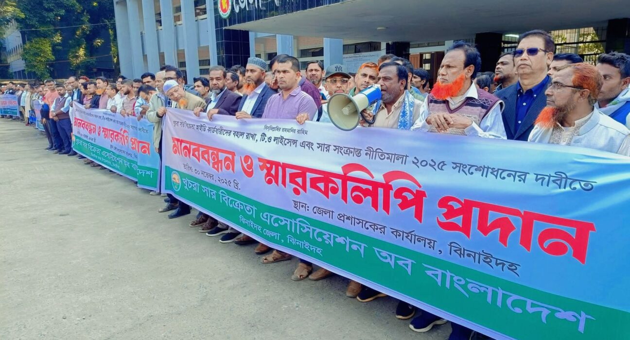 ঝিনাইদহে খুচরা সার বিক্রেতাদের মানববন্ধন ও জেলা প্রশাসক বরাবর স্মারকলিপি প্রদান