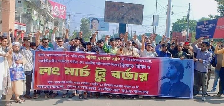 জুলাই আন্দোলনের সম্মুখ সারির যোদ্ধা শরিফ ওসমান হাদিকে পরিকল্পিতভাবে হত্যার অভিযোগে, অন্তর্বর্তীকালীন সরকারের ব্যর্থতা ও ভারতীয় আধিপত্যের প্রতিবাদে যশোরের বেনাপোলে বিক্ষোভ মিছিল ও ‘লং মার্চ টু বর্ডার’ কর্মসূচি পালিত হয়েছে।