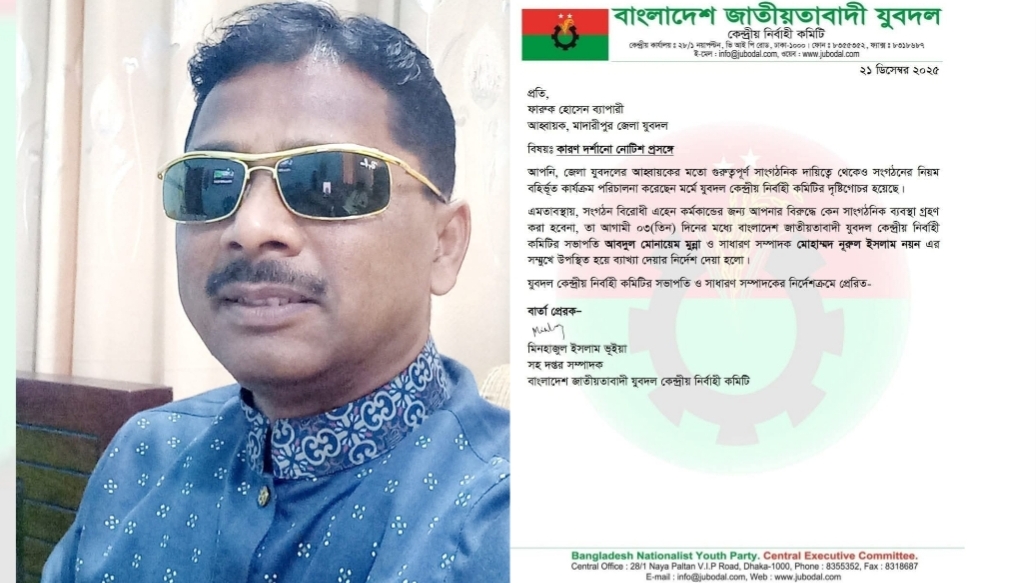 জেলা যুবদলের আহ্বায়ক ফারুক বেপারীকে কেন্দ্রীয় কমিটির কারণ দর্শানোর নোটিশ