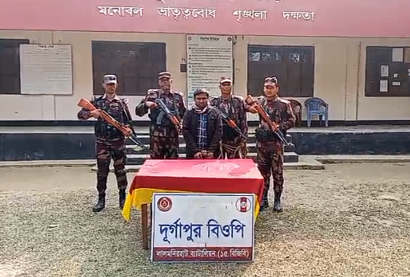 আজ ২৪ ডিসেম্বর ২০২৫ তারিখ মধ্যরাতে লালমনিরহাট ব্যাটালিয়ন (১৫ বিজিবি) এর দুর্গাপুর বিওপি’র একটি টহল দল দায়িত্বপূর্ণ এলাকার সীমান্ত পিলার ৯২৫/৫-এস হতে আনুমানিক ৭০০ গজ বাংলাদেশের অভ্যন্তরে কাউয়ারচর নামক স্থানে ভারতীয় নাগরিক বিশ্বজিৎ কুমার দাস’কে (২৫) আটক করেছে।