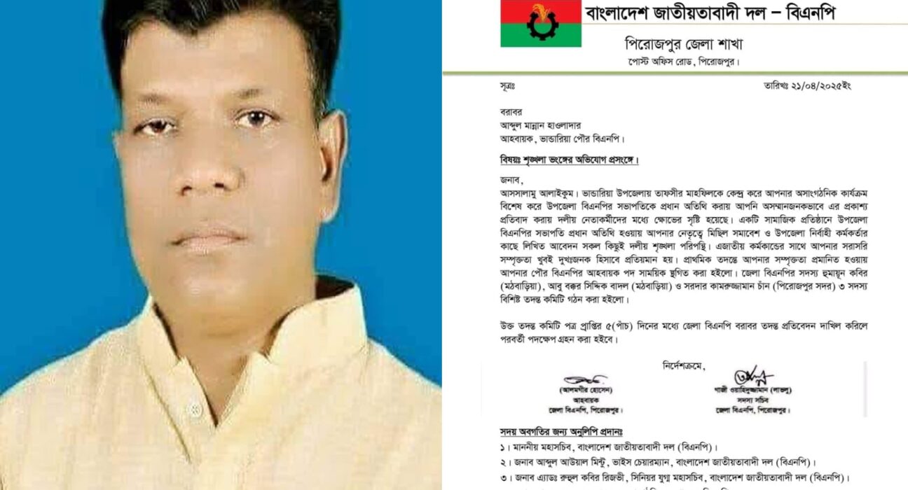 দুটি ঘটনাকেই দলীয় শৃঙ্খলা পরিপন্থী দাবি করে পিরোজপুর জেলা বিএনপি ভান্ডারিয়া পৌর বিএনপির আহ্বায়ক আব্দুল মান্নান হাওলাদারের দলীয় পদ স্থগিত করেছে। সোমবার (২১ এপ্রিল) রাতে জেলা বিএনপির আহ্বায়ক অধ্যক্ষ আলমগীর হোসেন ও সদস্য সচিব গাজী ওয়াহিদুজ্জামান ওরফে লাভলু স্বাক্ষরিত এক বিজ্ঞপ্তিতে তার দলীয় পদ স্থগিত করা হয়। একই সঙ্গে ঘটনার তদন্তে তিন সদস্যের কমিটি করা হয়েছে। কমিটির সদস্যরা হলেন – জেলা বিএনপির সদস্য হুমায়ুন কবির, আবু বক্কর সিদ্দিক বাদল ও সরদার কামরুজ্জামান চাঁন। এ তদন্ত কমিটিকে চিঠি পাওয়ার পাঁচ দিনের মধ্যে জেলা বিএনপি বরাবরে প্রতিবেদন দাখিলের সময়সীমা বেঁধে দেওয়া হয়।