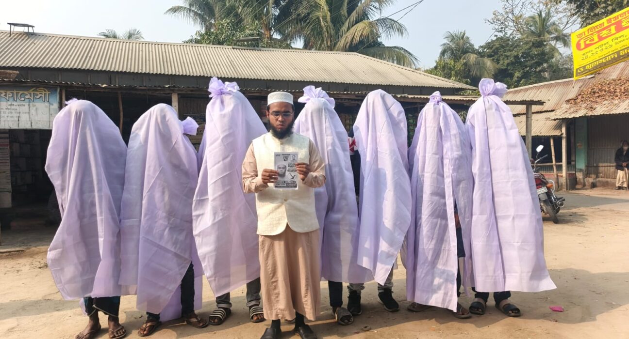 ফরিদপুর-৪ আসনে কাফনের কাপড় পরে ব্যাতিক্রম নির্বাচনী প্রচারণা