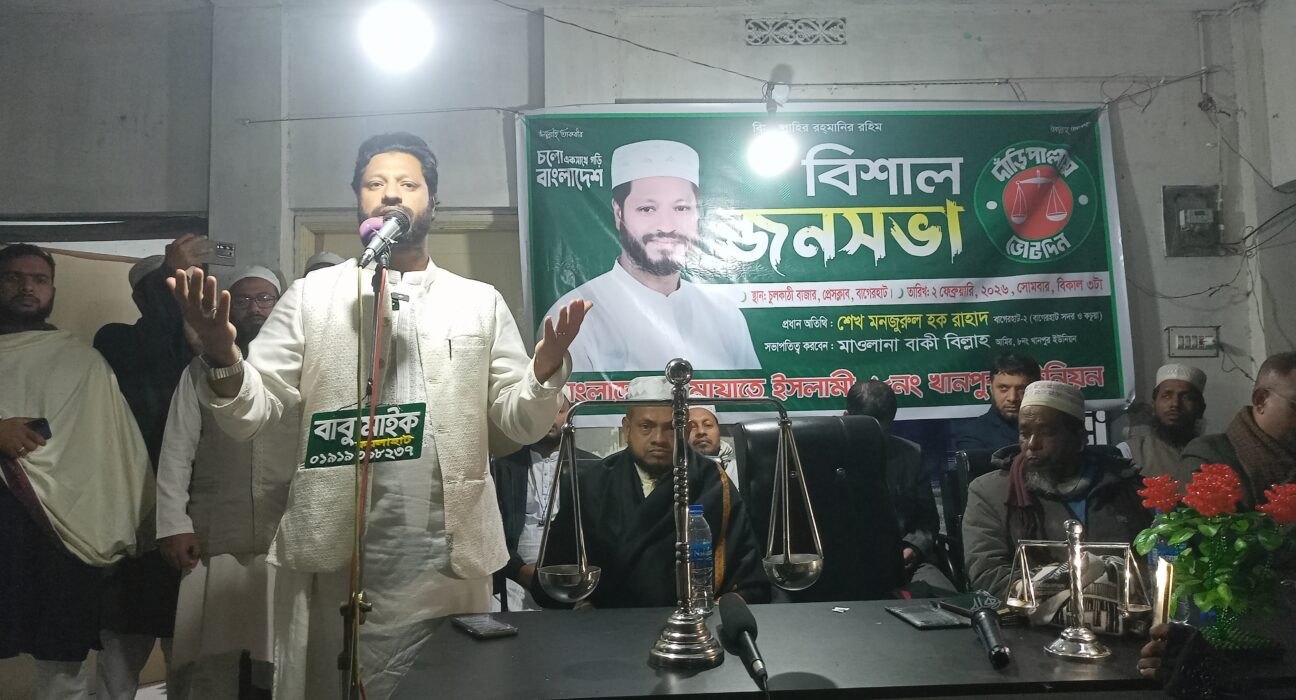 বাগেরহাটে সদর উপজেলার চুলকাটি বাজারে ১১ দলীয় মনোনীত বাংলাদেশ জামায়াতে ইসলামী’র প্রার্থী শেখ মনজুরুল হক রাহাদ এর নির্বাচনী জনসভা অনুষ্ঠিত হয়েছে।
