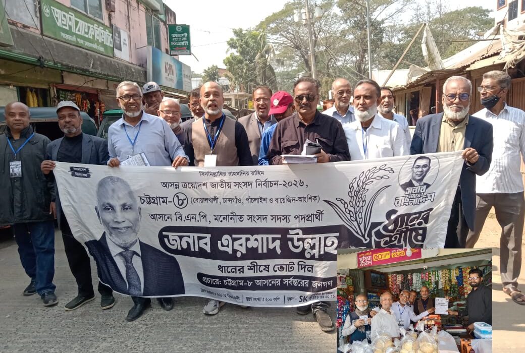 চট্টগ্রামে-৮ সংসদীয় আসন ধানের শীষের বিএনপি মনোনীত প্রার্থী ও মহানগর আহ্বায়ক আলহাজ্ব এরশাদ উল্লাহ’র সমর্থনে ধানের শীষে ভোট চাইলেন আশি’র দশকের ছাত্রদল নেতৃবৃন্দ।
