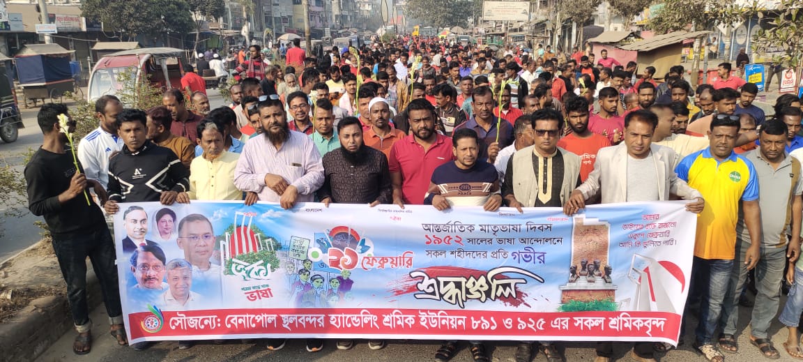 মহান একুশে ফেব্রুয়ারি আন্তর্জাতিক মাতৃভাষা দিবস উপলক্ষে বেনাপোল স্থলবন্দর হ্যান্ডেলিং শ্রমিক ইউনিয়ন ৯২৫ এর সকল শ্রমিক বৃন্দরা ১৯৫২ ভাষা শহীদদের প্রতি গভীর শ্রদ্ধাঞ্জলি জানানো হয়েছে।