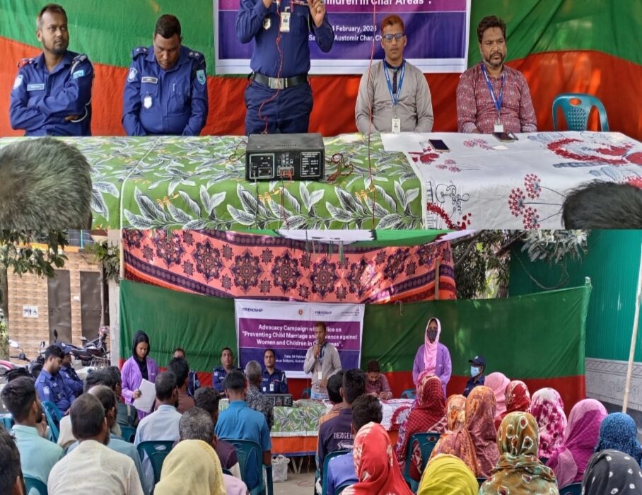অষ্টমীর চর ইউনিয়নের ছালিপাড়া চরে, ঢুষমারা থানা পুলিশের সাথে এডভোকেসি ক্যাম্পেইন অনুষ্ঠিত হয়েছে। আলোচনার বিষয়বস্তু ছিল বিবাহ প্রতিরোধ এবং নারী ও শিশু নির্যাতন বন্ধে পদক্ষেপ। এবং প্রাসঙ্গিক আলোচনা হিসাবে ছিল, যৌতুক, বহুবিবাহ, মাদক, ইভটিজিং, পারিবারিক সহিংসতা, মোবাইল ফোনের ক্ষতিকর প্রভাব ও আইনি সহায়তা প্রদানকারী বিভিন্ন সরকারি ও বেসরকারি সংস্থা সমূহের সেবা ও পরামর্শ বিষয়ক সচেতনতা বৃদ্ধি করা। এ সময় উপস্থিত ছিলেন ঢুষমারা থানার অফিসার ইনচার্জ সাঈদ মিয়া, এবং ৩জন এসআই ও ২জন কনস্টেবল ছিলেন। আরও উপস্থিত ছিলেন, ফ্রেন্ডশিপের প্রজেক্ট ম্যানেজার আব্দুল মান্নান, সুশাসন প্রকল্প। প্রজেক্ট অফিসার মেহেদী হাসান, সিনিয়র সুপারভাইজার মোস্তাফিজুর রহমান, সিনিয়র সুপারভাইজার শফিকুল ইসলামসহ আরও অনেকে বক্তব্য রাখেন। এ বিষয়ে ঢুষমারা থানার অফিসার ইনচার্জ, প্রান্তিক এবং সুবিধা বঞ্চিত জনগণের জন্য এ ধরনের এডভোকেসি ক্যামপেইনের কার্যকারিতা সম্পর্কে প্রশংসা করেন। এবং সুশাসন প্রকল্পকে প্রতি বিশেষ ধন্যবাদ জানান।