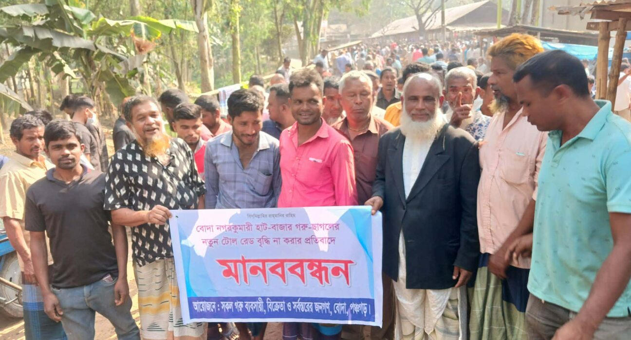 পঞ্চগড়ের বোদা পৌরসভা এলাকার নগরকুমারী গরুর হাটে গরু-ছাগলের টোল বৃদ্ধি না করার দাবিতে মানববন্ধন করেছেন ব্যবসায়ী ও স্থানীয়রা।
