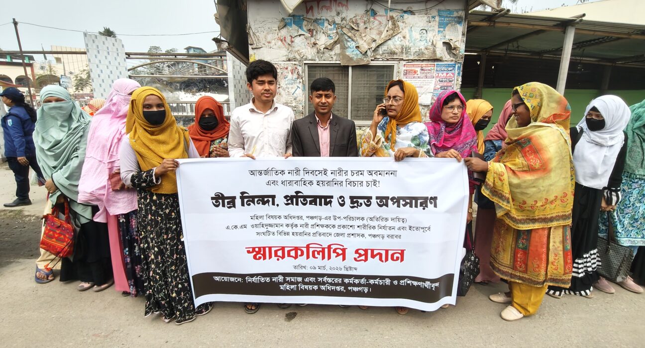 নারী দিবসে অফিসের নারী কর্মীকে লাঞ্ছিত করার অভিযোগে পঞ্চগড় জেলা মহিলা বিষয়ক অধিদপ্তরের উপ পরিচালকের (অ.দা.) থাকা বোদা উপজেলার মহিলা বিষয়ক কর্মকর্তা একেএম ওয়াহিদুজ্জামানকে অপসারণের দাবিতে মানববন্ধন করেছে ভুক্তভোগী নারীসহ মহিলা বিষয়ক অধিদপ্তরের কর্মকর্তা কর্মচারীরা।