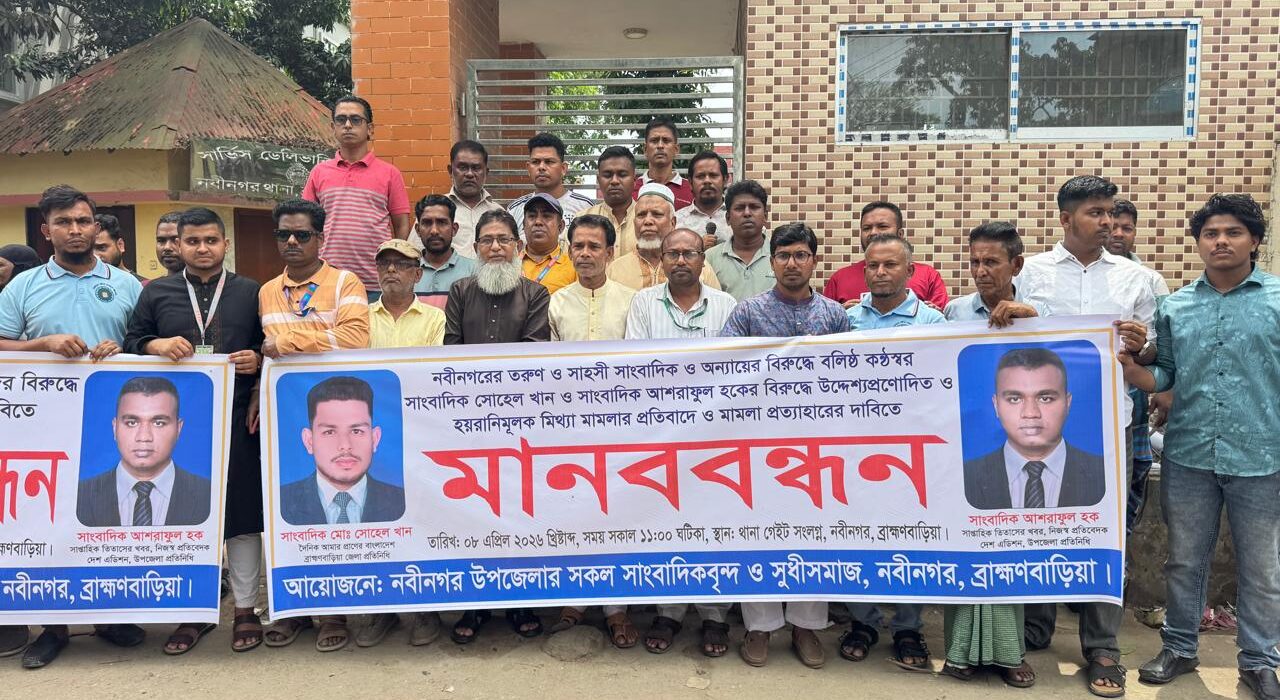 ব্রাহ্মণবাড়িয়ার নবীনগরের দুই তরুণ ও সাহসী সাংবাদিক সোহেল খান এবং আশরাফুল হকের বিরুদ্ধে উদ্দেশ্যপ্রণোদিত ও হয়রানিমূলক মিথ্যা মামলার প্রতিবাদে ফুঁসে উঠেছে স্থানীয় সাংবাদিক সমাজ। এই ‘মিথ্যা মামলা’ অবিলম্বে প্রত্যাহারের দাবিতে আজ বুধবার (০৮ এপ্রিল) নবীনগর থানা গেট সংলগ্ন এলাকায় এক বিশাল মানববন্ধন অনুষ্ঠিত হয়েছে।
