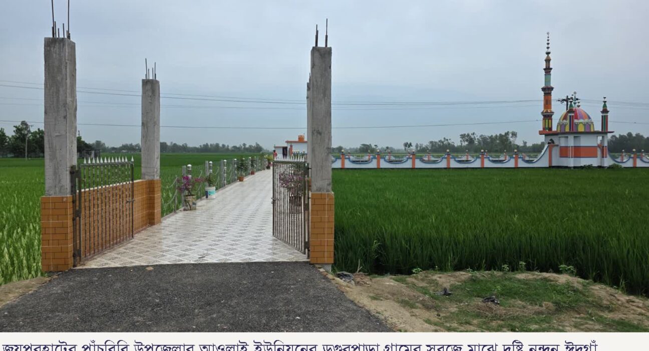জয়পুরহাটের পাঁচবিবি উপজেলায় সবুজ ধানক্ষেতের মাঝখানে গড়ে উঠেছে দৃষ্টিনন্দন একটি ঈদগাঁ মাঠ।