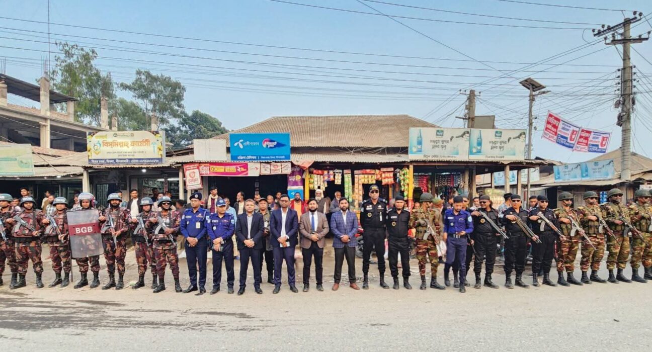 হযরত আলী বেলাল, ডিমলা (নীলফামারী) প্রতিনিধি: আসন্ন ত্রয়োদশ জাতীয় সংসদ নির্বাচনকে সামনে রেখে নীলফামারীর ডিমলা উপজেলায় আইনশৃঙ্খলা পরিস্থিতি স্বাভাবিক রাখতে উপজেলা প্রশাসনের উদ্যোগে যৌথ বাহিনীর নির্বাচনী মহড়া অনুষ্ঠিত হয়েছে। বুধবার (৪ ফেব্রুয়ারি) বিকাল থেকে সন্ধ্যা পর্যন্ত উপজেলার গুরুত্বপূর্ণ সড়ক ও জনবহুল এলাকায় এ মহড়া পরিচালনা করা হয়।