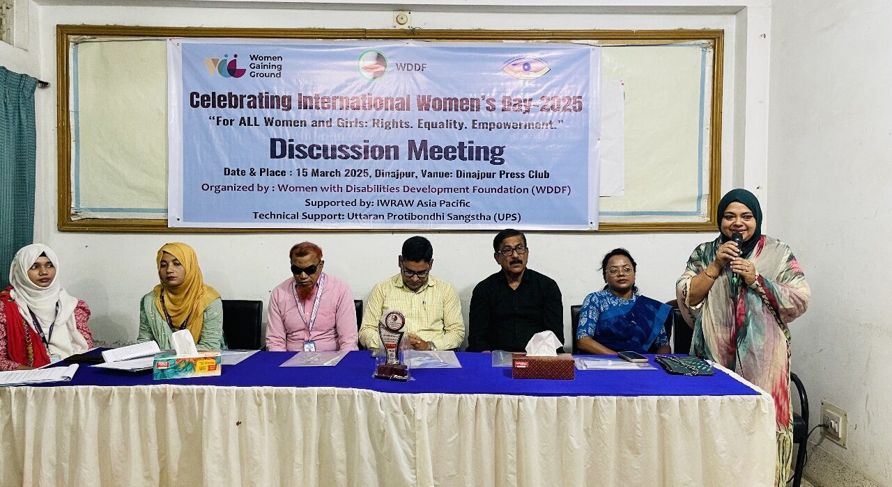 অধিকার, সমতা, ক্ষমতায়ন, নারী ও কন্যার উন্নয়ন-এবারের আন্তর্জাতিক নারী দিবস,২০২৫ এর প্রতিপাদ্যকে সামনে রেখে ১৫ মার্চ,২০২৫ইং সকাল ১০.৩০টায় দিনাজপুর প্রেস ক্লাবের সম্মেলন কক্ষে ইন্টারন্যাশনাল উইম্যান রাইটস এ্যাকশান ওয়াচ্- এশিয়া প্যাসিফিক (আইডাব্লিউআরএডাব্লিউ-এপি) এর উইম্যান গেইনিং গ্রাউন্ড প্রজেক্ট এর অর্থায়নে উইম্যান উইথ ডিজএ্যাবিলিটিজ ডেভেলপমেন্ট ফাউন্ডেশন (ডাব্লিউডিডিএফ),ঢাকা এর সহায়তায় এবং স্থানীয়ভাবে উত্তরণ প্রতিবন্ধী সংস্থা ও সম্প্রীতি প্রতিবন্ধী উন্নয়ন সংস্থা এর সহযোগিতায় দিনাজপুরে আন্তর্জাতিক নারী দিবস,২০২৫ উপলক্ষে আলোচনা সভা অনুষ্ঠিত হয়। উত্তরণ প্রতিবন্ধী সংস্থার নির্বাহী পরিচালক মোঃ আশরাফুল আলম এর সভাপতিত্বে আলোচনা সভায় সম্মানিত অতিথি হিসেবে উপস্থিত ছিলেন মহিলা বিষয়ক অধিদপ্তর এর ডে-কেয়ার অফিসার রেজভীন সারমিনাজ ইসলাম, জেলা সমাজসেবা কার্যালয়ের সহকারী উপপরিচালক (অতিরিক্ত দায়িত্ব) মোঃ ময়নুল হক, ব্লাস্ট দিনাজপুর ইউনিটের  প্যারালিগ্যাল আনজু আরা এবং পারভীন আক্তার, দিনাজপুর প্রেসক্লাবের সাধারণ সম্পাদক গোলাম নবী দুলাল, আদর্শ মহাবিদ্যালয়ের ইংরেজি বিভাগের বিভাগীয় প্রধান মোছাঃ রুবি আফরোজ। এছাড়া উত্তরণ প্রতিবন্ধী সংস্থা ও সম্প্রীতি প্রতিবন্ধী উন্নয়ন সংস্থার প্রতিবন্ধী নারী সদস্যরা আলোচনা সভায় অংশগ্রহণ করেন।