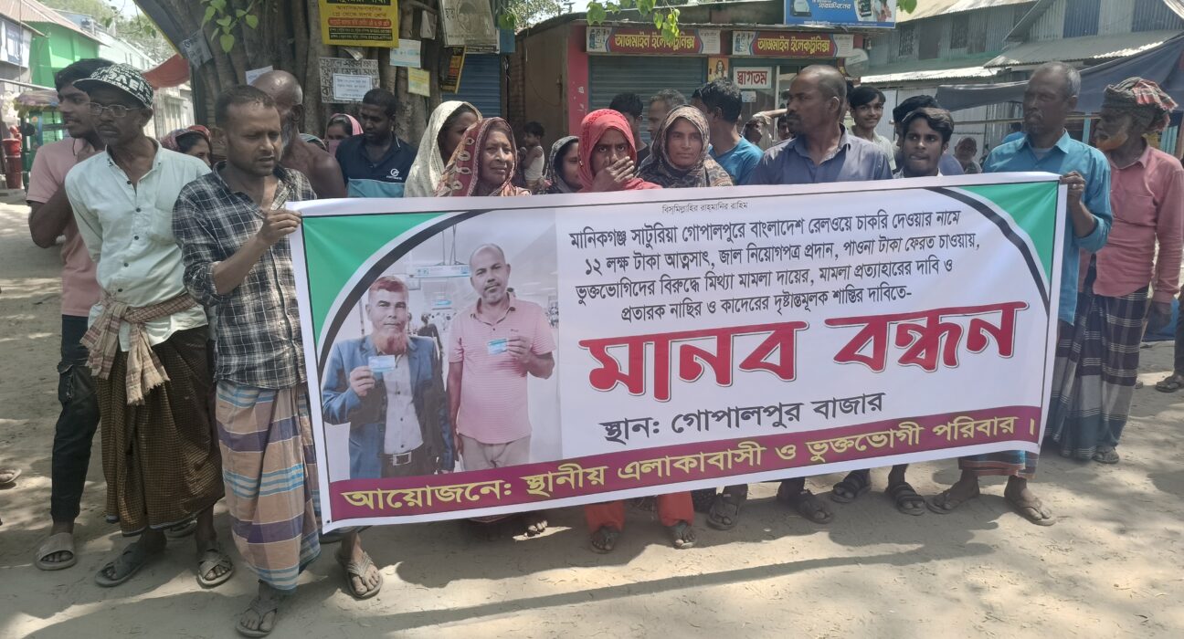 মানিকগঞ্জে চাকুরীর প্রলোভন দিয়ে টাকা আত্মসাৎ, প্রতিকার চেয়ে মানববন্ধন