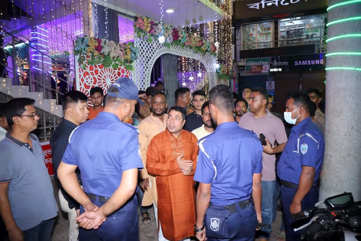 আইনশৃংখলা ও নিরাপত্তা নিশ্চিত করতে ফেনী শহরের বিপনী বিতান পরিদর্শনে ফেনীর পুলিশ সুপার।